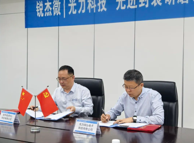 2025年4月28日,光力科技半導體裝備板塊全資子公司光力瑞弘電子科技有限公司(ADT)與銳杰微科技(鄭州)有限公司(RMT)在鄭州隆重舉行戰略合作簽約儀式。