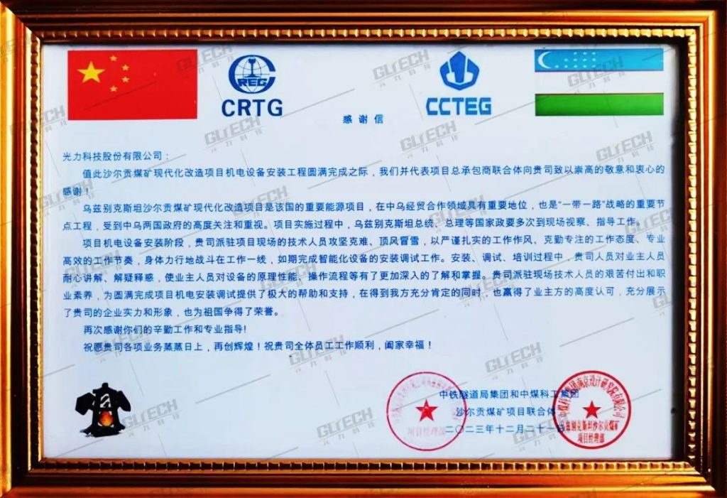 作為根植中國的本土企業,光力科技積極參與烏茲別克斯坦煤礦智能化系統建設,弘揚”絲路精神”,響應國家“一帶一路”政策,積極協辦中國-中亞安全能力提升研討會,踐行“中國產品向中國品牌的轉變”,光力科技客戶成功團隊秉承專業、熱情、主動、高效的服務理念贏得了項目總承包商聯合體的認可,并收到感謝信。